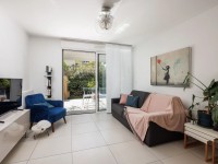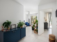 Une grande entrée, deux chambres dont une donnant sur la terrasse et le jardin, un séjour donnant également sur la terrasse-jardin, une cuisine ouverte équipée, une salle de douche avec WC.